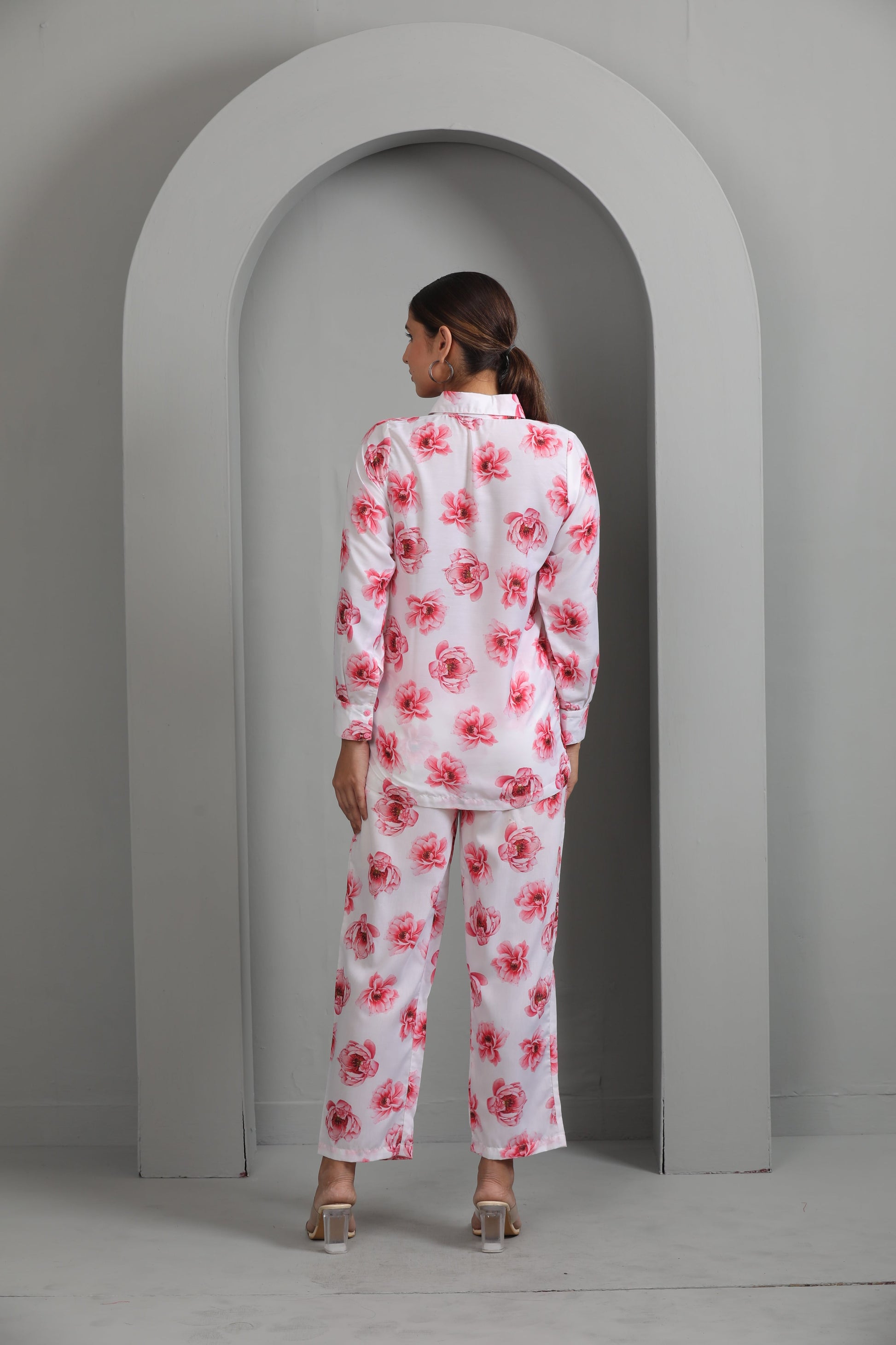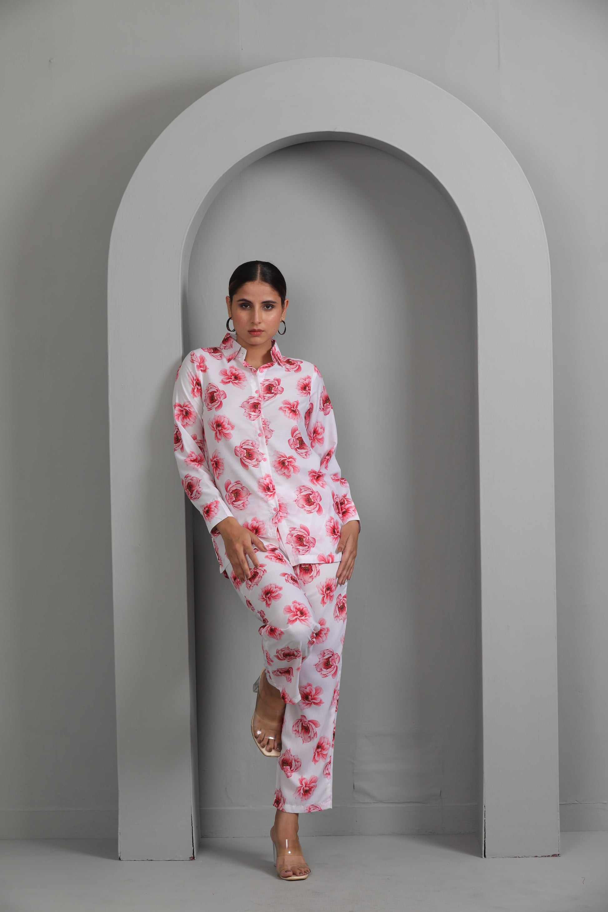 A chic two-piece coord set shines, crafted from pink floral muslin, the ensemble exudes comfort and style. The collar neck and full sleeves bring an air of sophistication, while the front buttons add a touch of intrigue. With a comfortable fit and no lining, this is formal wear that embodies ease and elegance.