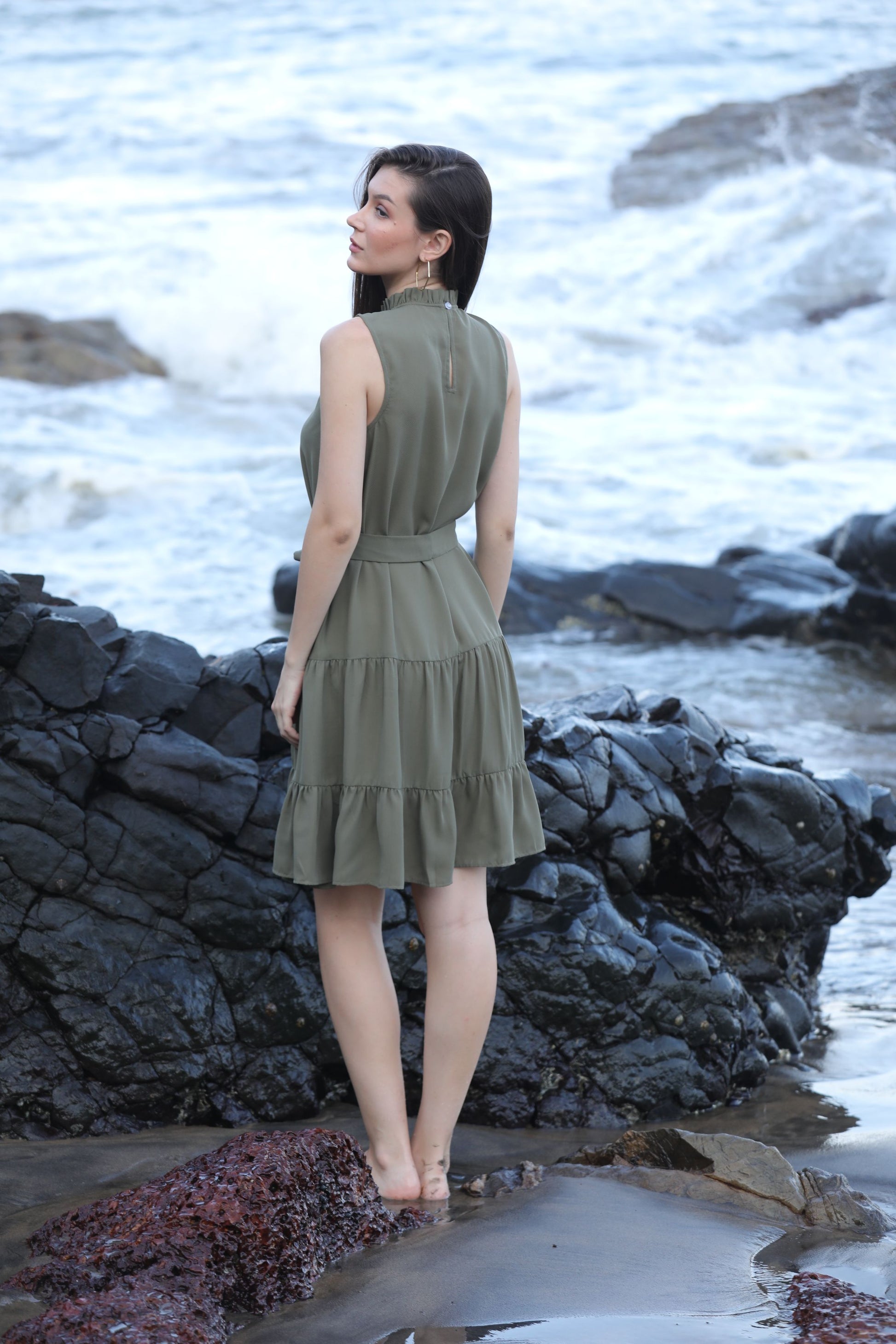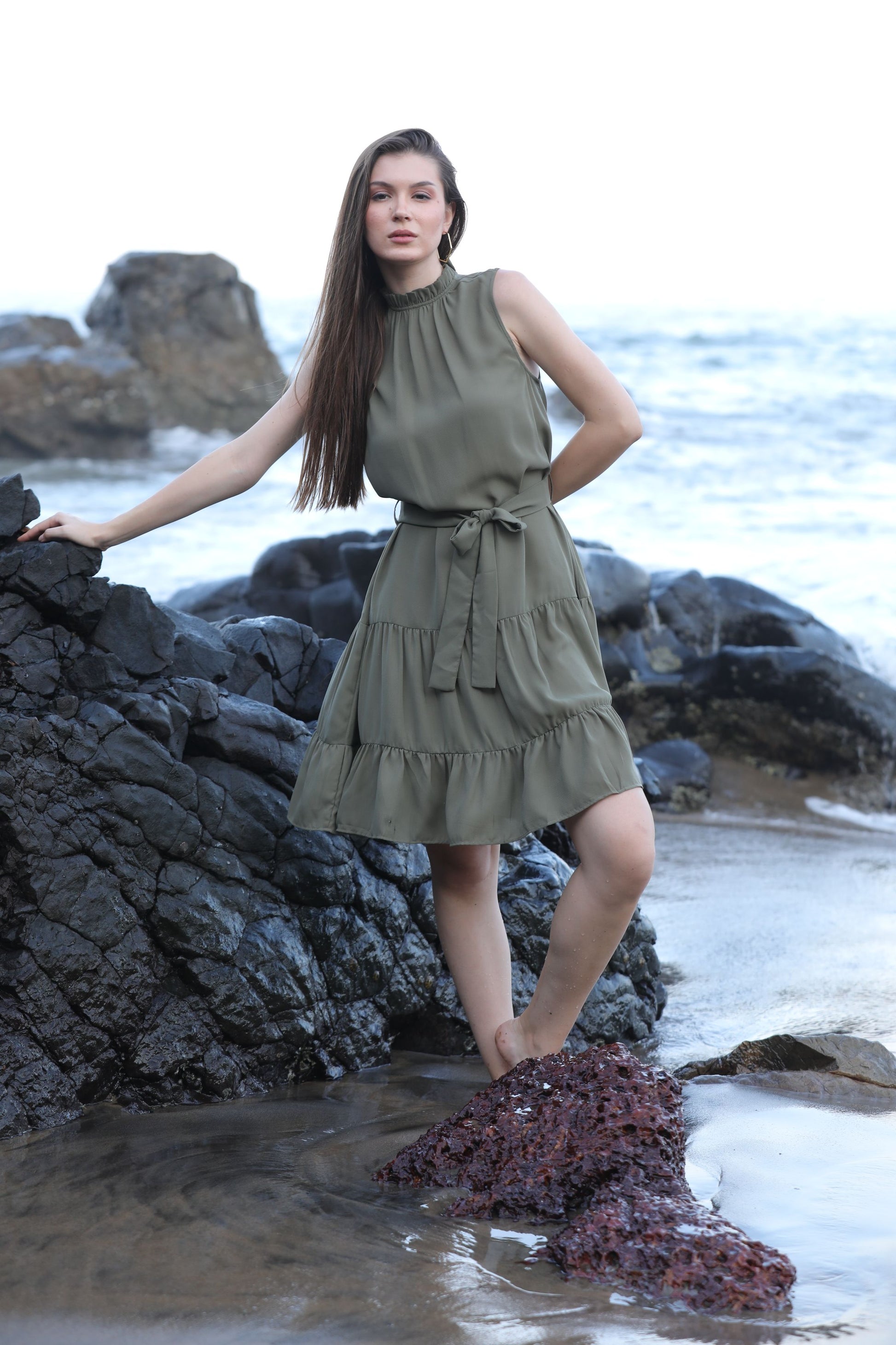 BRAHMOS SLEEVLESS DRESS WITH BELT - OLIVE