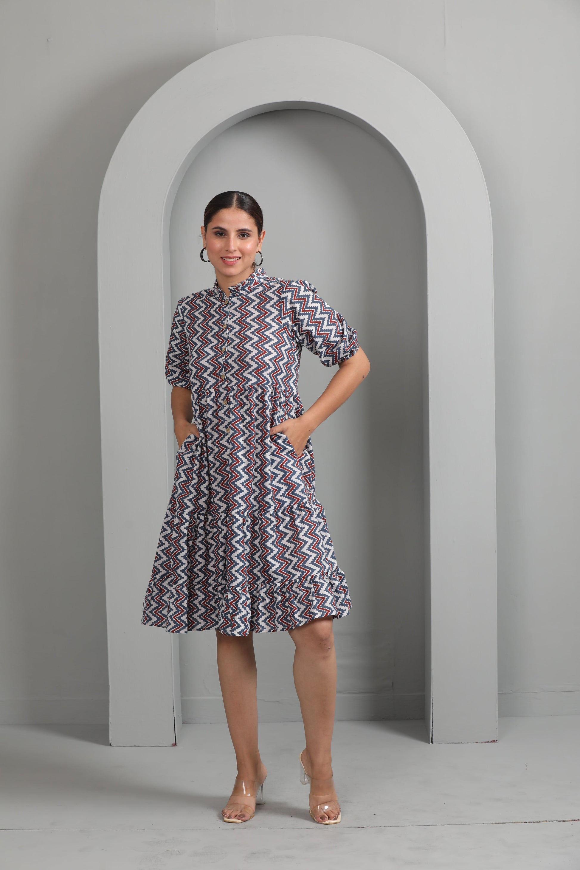 Experience versatile elegance with our Cotton Multi-Occasion Dress. Featuring a Band Neck collar, comfort fit, tiered design, and front button-down. Enjoy the convenience of 2 side pockets and the timeless appeal of knee length. Perfect for a range of events.