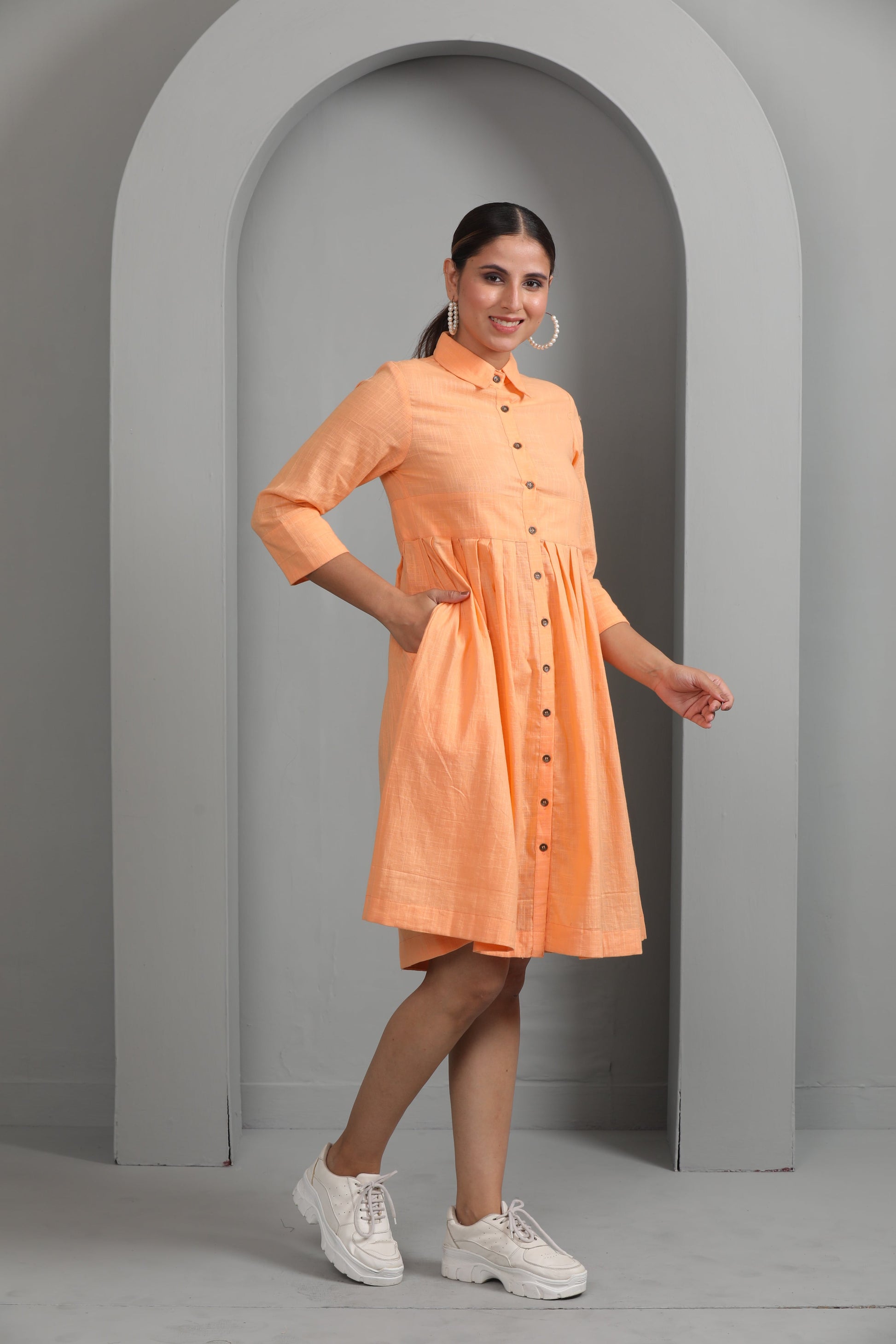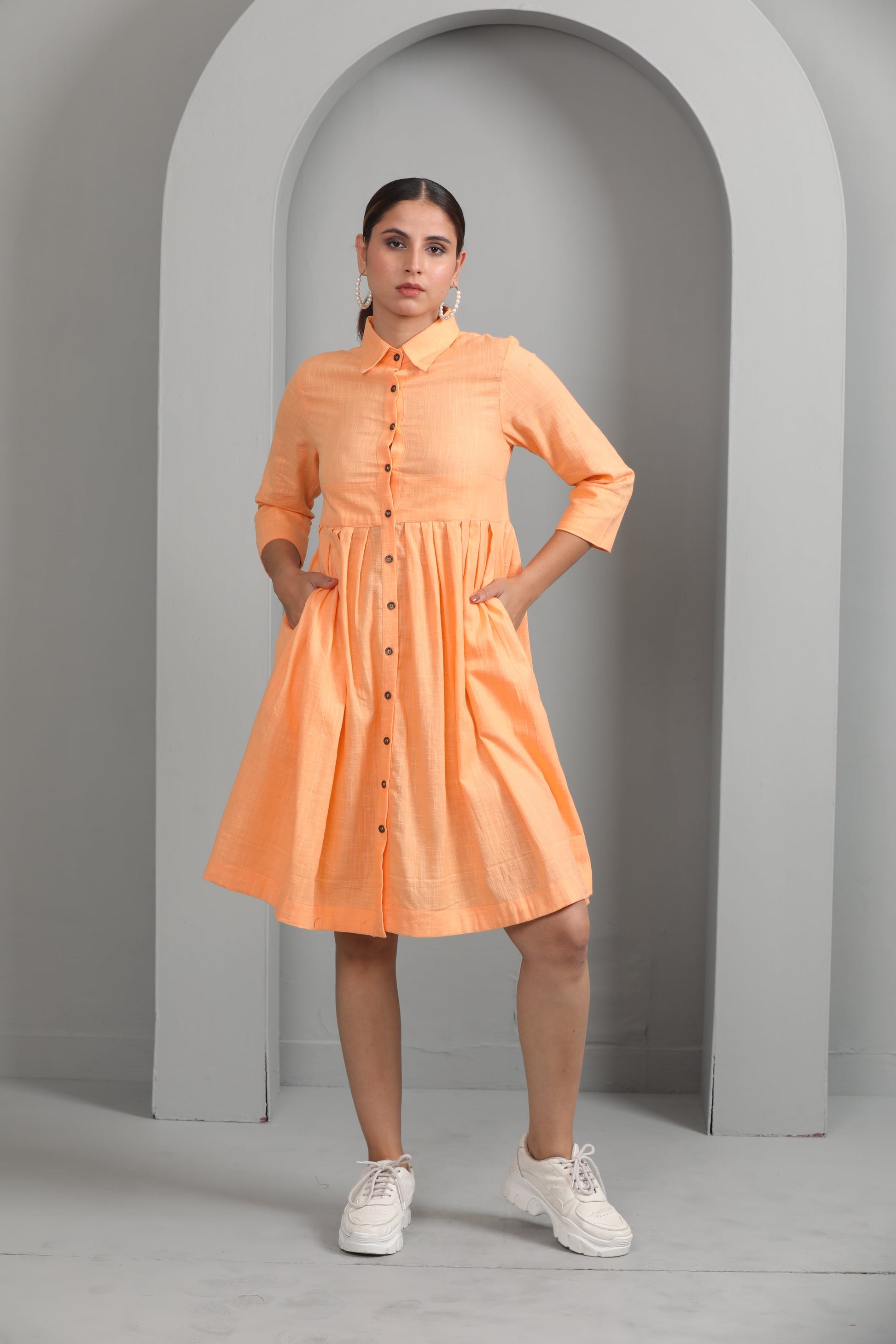 Cotton midi dress for various occasions. Shirt collar, front button-down, and comfort fit. Two side pockets, no lining. Simple and versatile. Practicality meets fashion with the addition of two side pockets, offering convenience without compromising on aesthetics. Overall, this midi dress is an embodiment of effortless style and adaptability, ready to grace numerous occasions with its understated charm.