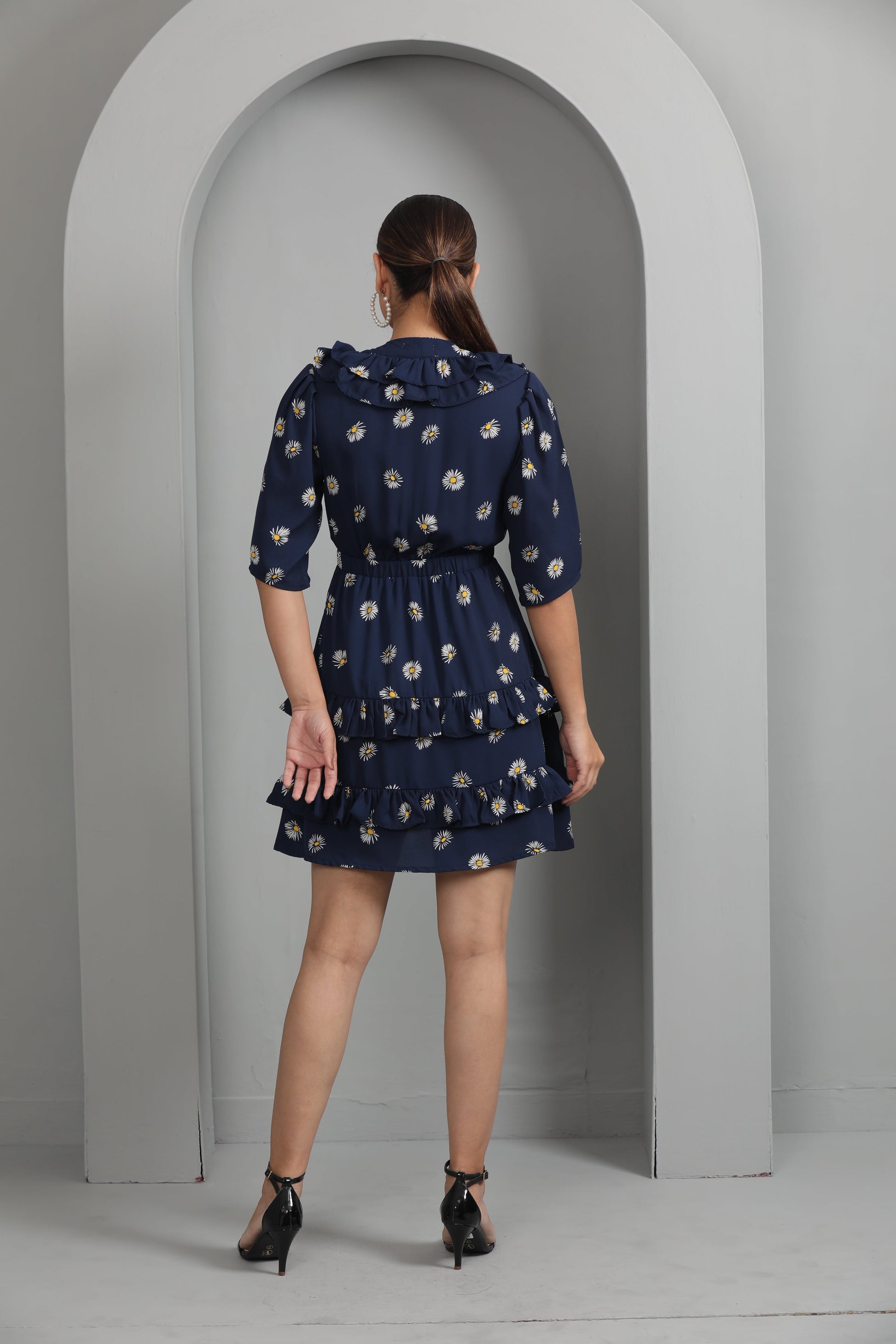 Elevate your style with our Stylish Navy Sunflower Dress! 🌻👗 Crafted from comfortable viscose fabric, this three-tiered knee-length dress is perfect for party wear. With a flattering V-neck, ruffles at the neck and tiers, and an elastic waist, it's the epitome of comfort and style. Half sleeves add a touch of elegance. The navy hue with sunflower prints will make you stand out. Pair it with high heels for a touch of sophistication or your favorite sneakers for a chic twist. Available in sizes from S to XL, this dress is a must-have for your wardrobe. 💃 #SunflowerStyle #NavyChic #VicoseFashion #ComfortWear #StylishAndComfy #DressToImpress #SizeInclusiveFashion #VersatileStyle #FashionFinds #StandOutStyle #ReadyToGo #Fashionista #WardrobeEssential #KneeLengthDress #HighHeelHaven #SneakerStyle