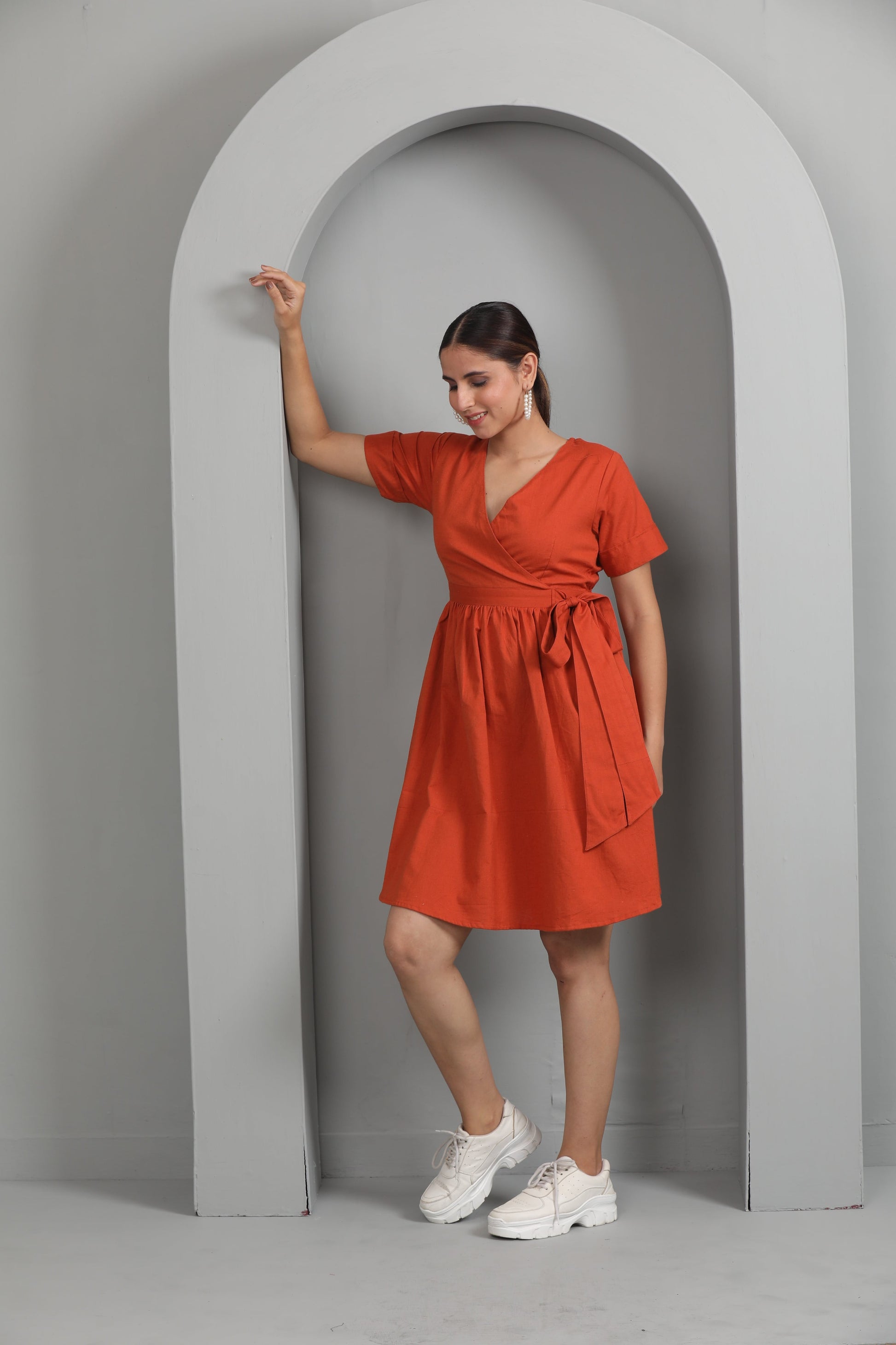 Elevate your style with our Stylish Cotton Slub Side Knot Dress! 💃👗 This knee-length beauty is designed to give you that 'wow' look. With rolled-up half sleeves, a front neck overlapping V-neck, and a side knot, it's all about sleek and stylish design. Crafted from pure cotton slub fabric without lining, it offers comfort and breathability. This solid color dress is versatile, pairing perfectly with high heels or casual sneakers. It's the epitome of comfort and style, making it a must-have in your wardrobe. The elastic at the back ensures a great fit. Get ready to make a statement! 💖 #CottonSlubDress #StylishKnot #ComfortAndStyle #SizeInclusiveFashion #FashionFinds #StandOutStyle #ReadyToGo #HighHeelHaven #ComfortableCotton #ChicAndComfortable #SleekLook #Fashionista 🌟👠