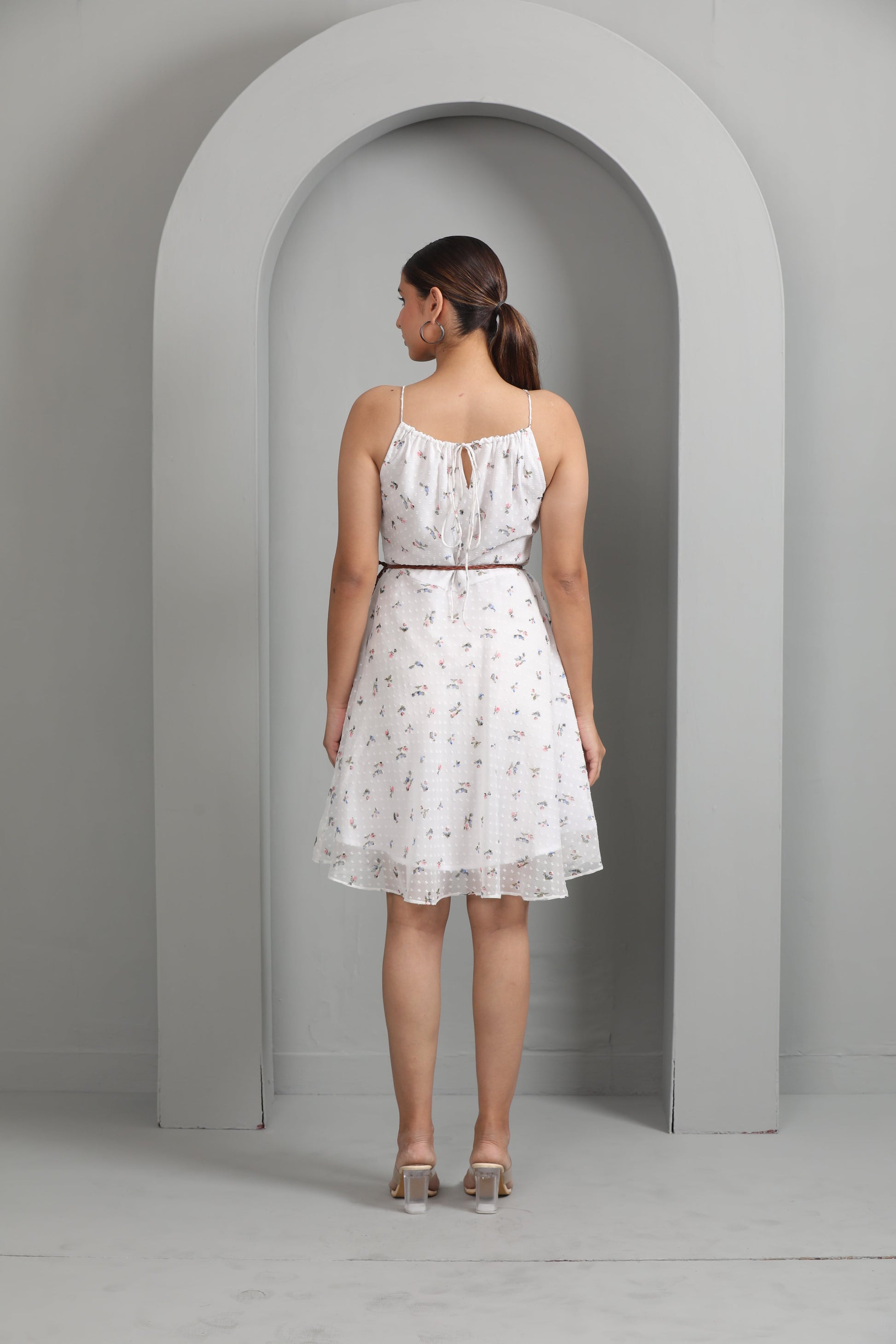Step into Elegance with Our White Chiffon Floral Printed Dress 🌼👗 Featuring Adjustable Tie Strings at the Neck for a Personalized Touch. With a Concealed Side Zipper for Easy Wearing, This Knee-Length Dress is Crafted from Soft Fabric, Offering a Delicate Look that's the Perfect Blend of Elegance and Comfort. 🌸✨
